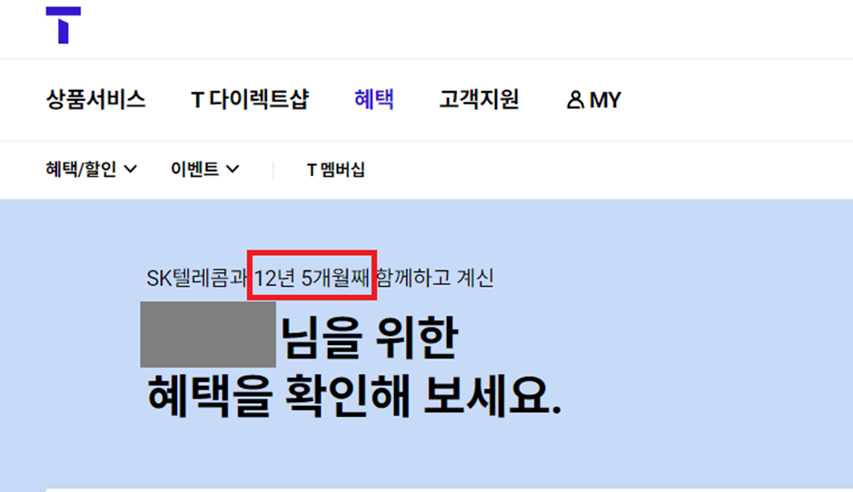 T World에 가셔서 로그인을 한 후, 혜택에 들어가시면 상단에 가입 기간을 안내 해줍니다.